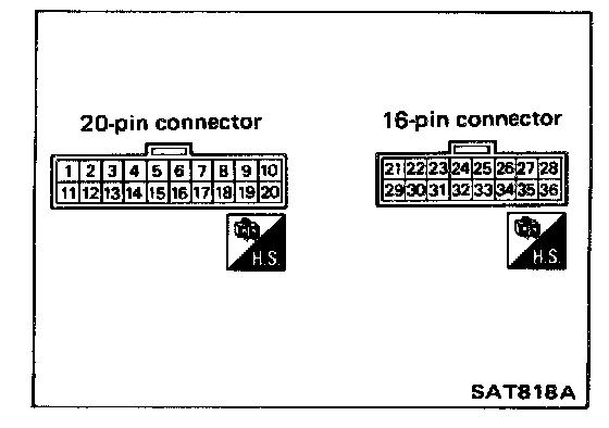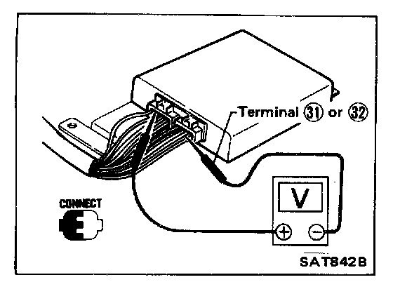 INSPECTION OF A/T CONTROL UNIT- Measure voltage between each terminal and terminal (31) or (32) by following "A/T CONTROL UNIT INSPECTION TABLE".