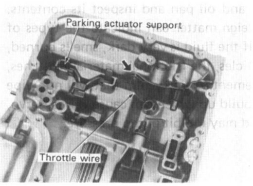 9. Disconnect throttle wire from throttle lever, then remove throttle wire. Remove parking actuator support from transmission case.