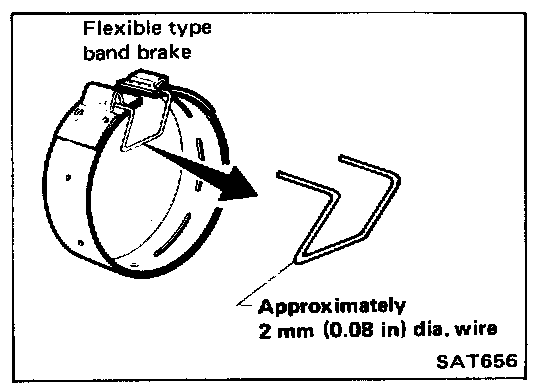 To prevent brake linings from cracking or peeling, do not stretch the flexible band unnecessarily. Before removing the brake band, always secure it with a clip as shown in the figure at left.