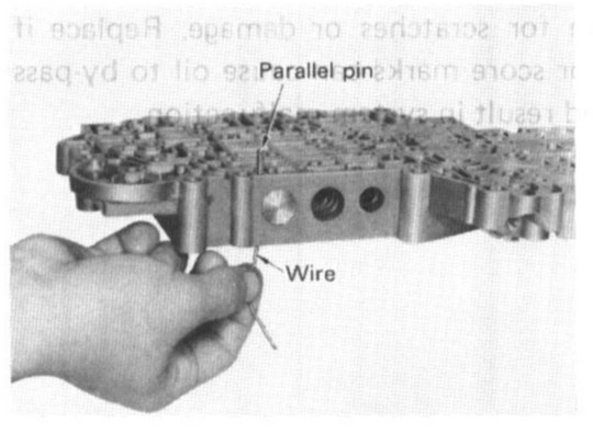 4. Check oil passages in upper and lower valve bodies for varnish deposits, scratches or other damage that would impair valve movement. Check threaded holes and related bolts and screws for stripped threads; replace as needed.