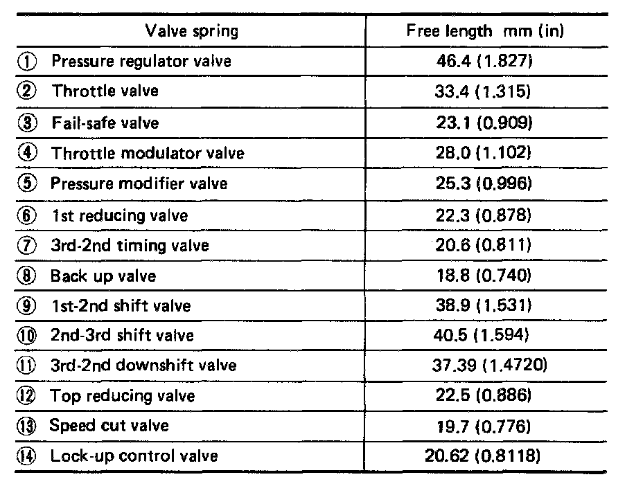 5. Check valve springs for damage. Measure free length of valve springs. If the free length is out of specification, replace it. Numbers of each valve spring listed in table below are the same as those in the figure at the top.