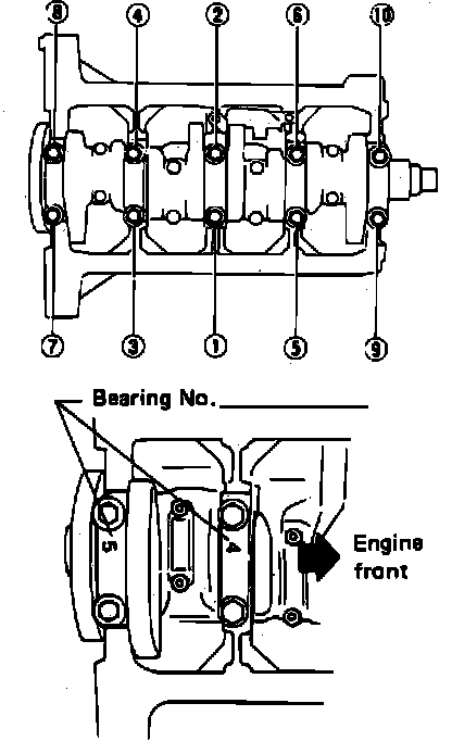 e. Tighten bearing cap bolts gradually in two or three steps in sequence shown in Fig. 12 to specification.
