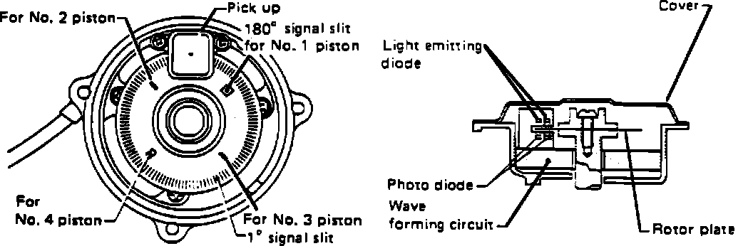 When the rotor passes between the photo diodes and LED's the slits in the rotor plate cut the light being transmitted to the photo diode from the LED. This generates pulses which are changed into ON/OFF signals by the wave forming circuit. The ECU interprets these signals to calculate engine rpm and cylinder position.