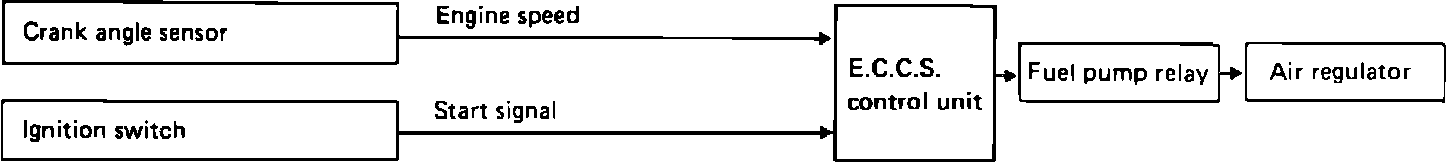 The ECU supplies the ground circuit for the fuel pump relay for a few seconds after the ignition switch is turned on. If the ECU receives a 1° signal from the crank angle sensor, indicating the engine is on or starting, it continuously supplies the circuit. If the 1° signal is not present, indicating a stalled engine, the ECU does not supply the ground circuit thereby preventing excessive battery discharge.