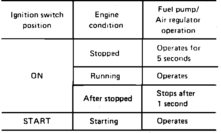 The air regulator, located on the the intake plenum, allows air to bypass the throttle plate when the engine is cold, providing fast idle. The fuel pump relay supplies the ground circuit to the bimetal heater and rotary shutter that closes off the passage as the element warms.