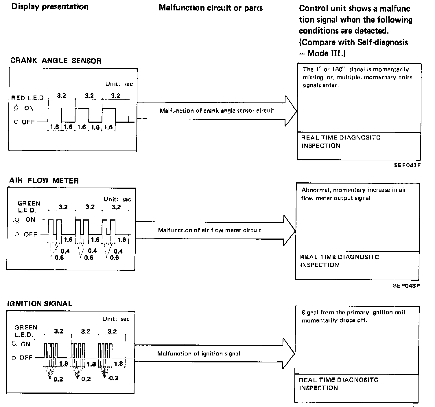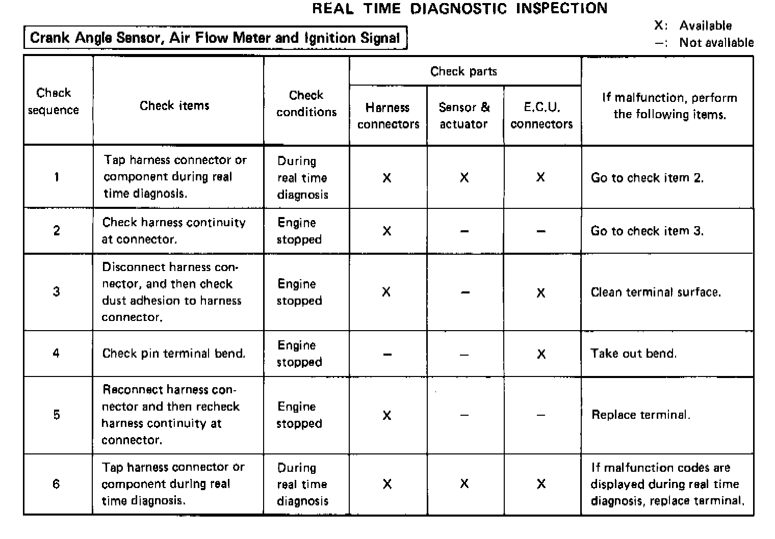 Consequently, this diagnosis is a very effective measure to diagnose whether the above systems cause the malfunction or not, during driving test. Compared with self-diagnosis, real time diagnosis is very sensitive, and can detect malfunctioning conditions in a moment. Further, items regarded to be malfunctions in this diagnosis are not stored in E.C.U. memory.