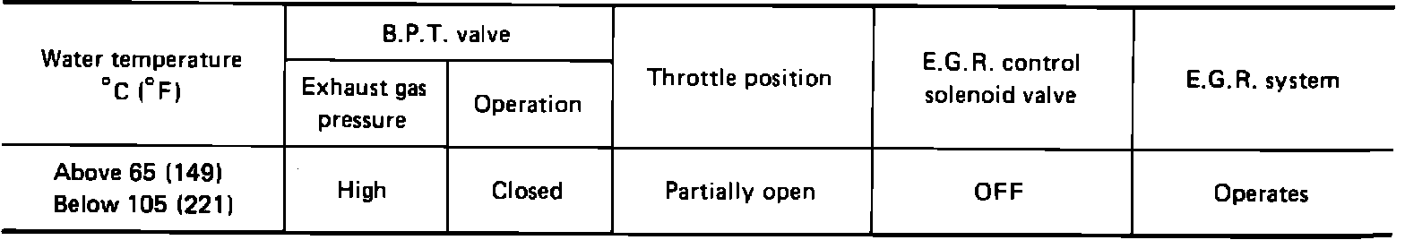 The EGR valve is controlled by the ECM through the EGR solenoid and by exhaust back pressure acting on the Back-Pressure Transducer (BPT) Valve. Vacuum is allowed to the EGR valve on acceleration and shut OFF upon deceleration or idling. The diaphragm mounted in the BPT valve raises in relation to exhaust pressure, opening an orifice allowing vacuum to be applied to the EGR Valve in response to the throttle opening.