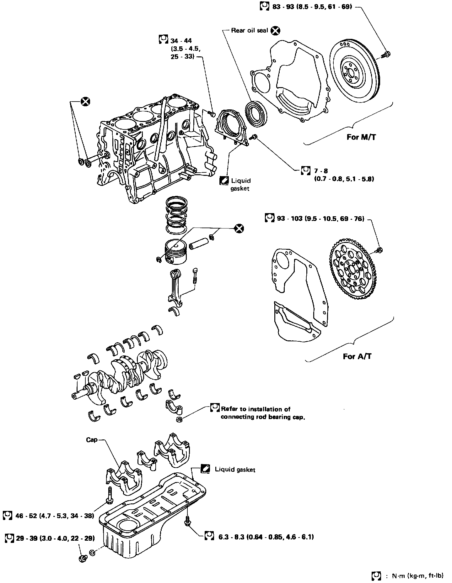 ^ Prior to tightening bearing cap bolts, place bearing cap in its proper position by shifting crankshaft in the axial direction.