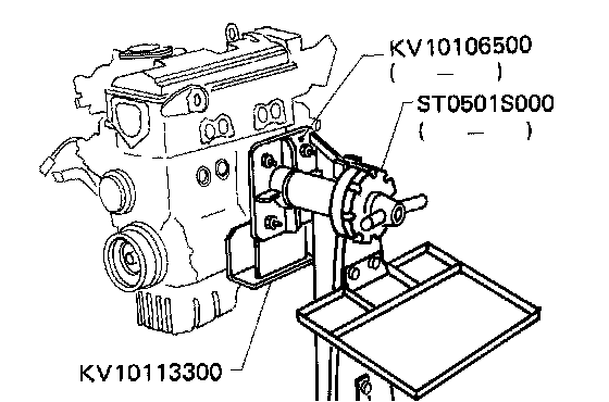 ^ When lifting engine, be careful not to strike adjacent parts, especially accelerator wire casing, brake lines, and brake master cylinder.