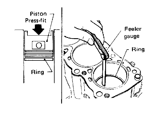 If out of specification, replace piston ring. If gap still exceeds the limit even with a new ring, rebore cylinder and use oversized piston and piston rings. Refer to Specifications.