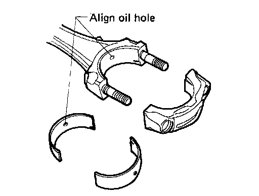^ Install bearings so that oil hole in connecting rod aligns with oil hole of bearing.