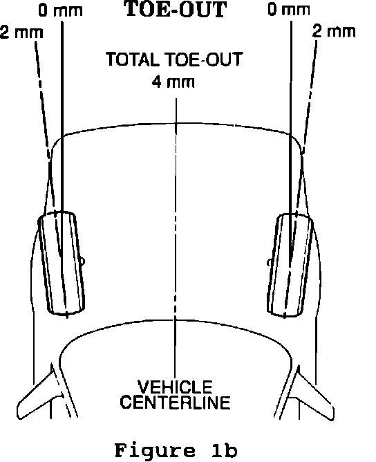 ^ Toe-Out is present when the tire is closer to the center line at the rear (Figure 1b).