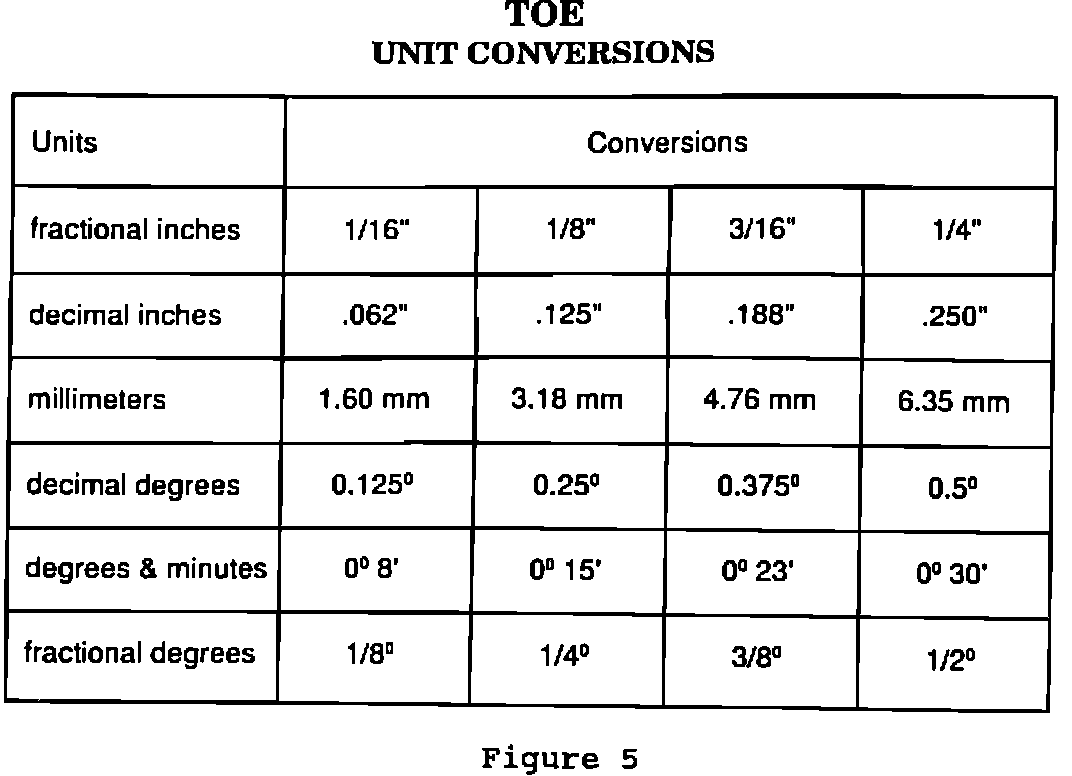 The chart (Figure 5) shows the relationship between the common units of Total Toe measurement. Conversions vary with wheel size. Reference the appropriate service manual for exact specifications.