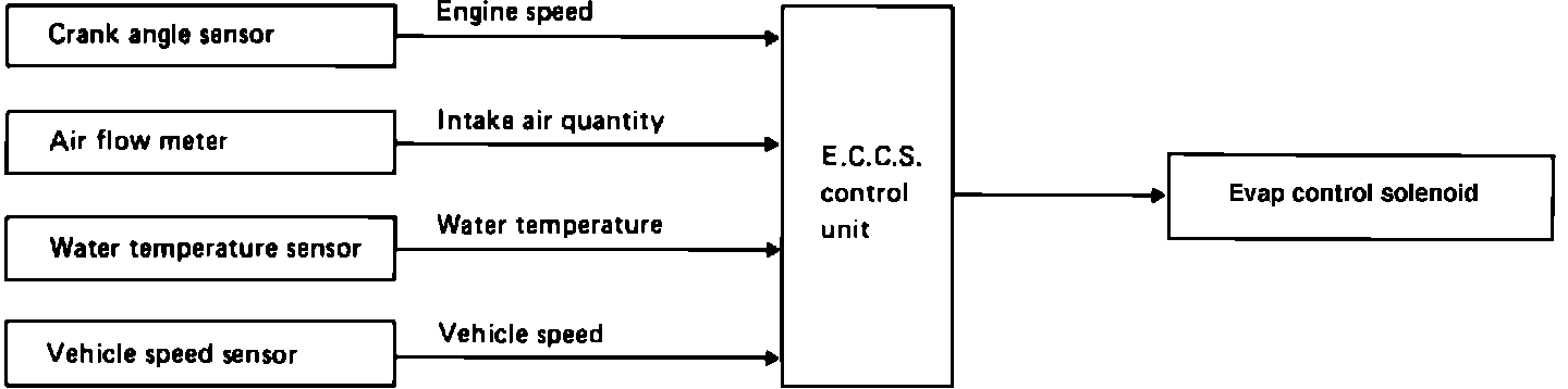 When conditions are NOT suitable for EVAP operation, based on signals sent via the crank angle sensor, air flow meter, engine temperature sensor and the vehicle speed sensor, the ECU energizes the solenoid. Refer to EMISSION CONTROLS for further description of the EVAP system.