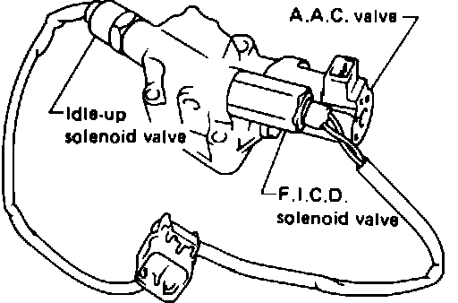 The idle up solenoid valve and fast idle control device (FICD) open additional air passages in the throttle chamber. The ECU provides the ground circuit to the solenoids. The windings in the solenoids pull plungers which allow additional amounts of air to bypass the throttle plate, raising the idle speed.