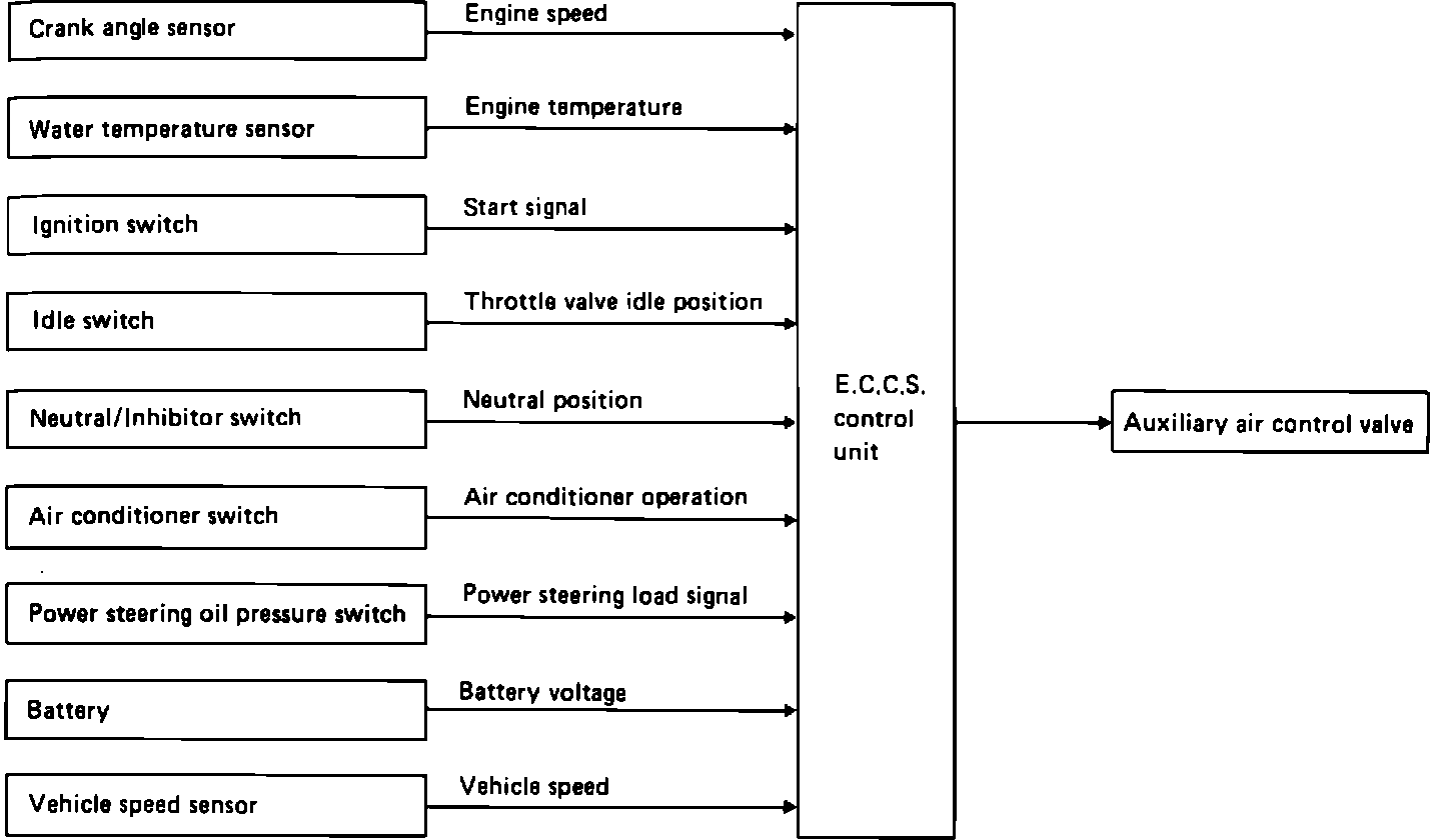 The idle speed is controlled by the amount of air that is allowed to bypass the throttle plate through the auxiliary air control (AC) valve. The AC valve is turned ON and OFF at a rate between 100 and 200 Hz. The ECU calculates the duty cycle (frequency of ON/OFF signals) necessary to maintain the proper idle speed, compensating for transmission gear position, electrical and accessory loads. In addition, the throttle body is equipped with an idle up solenoid and fast idle control device (FICD). They are activated by the ECU when the power steering load switch closes or an excessive electrical load is applied to the charging system, to allow an increased amount of air to bypass the throttle plate.