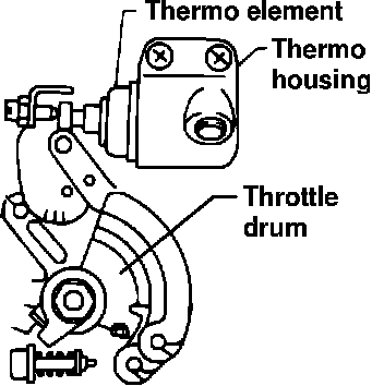 Cold engine fast idle is controlled by the throttle body mounted thermo element. The thermo wax element is a wax pellet operated plunger. Coolant is circulated through the element. When engine temperature is low the wax pellet contracts, extending the plunger which in turn opens the throttle. As coolant temperature increases, the wax pellet expands retracting the plunger, dropping the idle to curb speed.