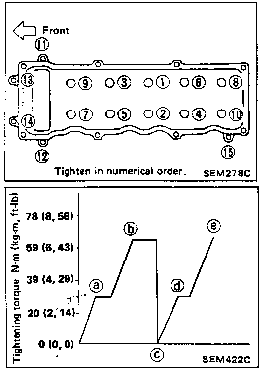 e. Turn bolt (1) 80 to 85 degrees clockwise and turn other bolts (2) - (10) 60 to 65 degrees clockwise. If angle wrench is not available, tighten all bolts to 59 to 69 Nm (6.0 to 7.0 kg-m, 43 to 51 ft-lb).