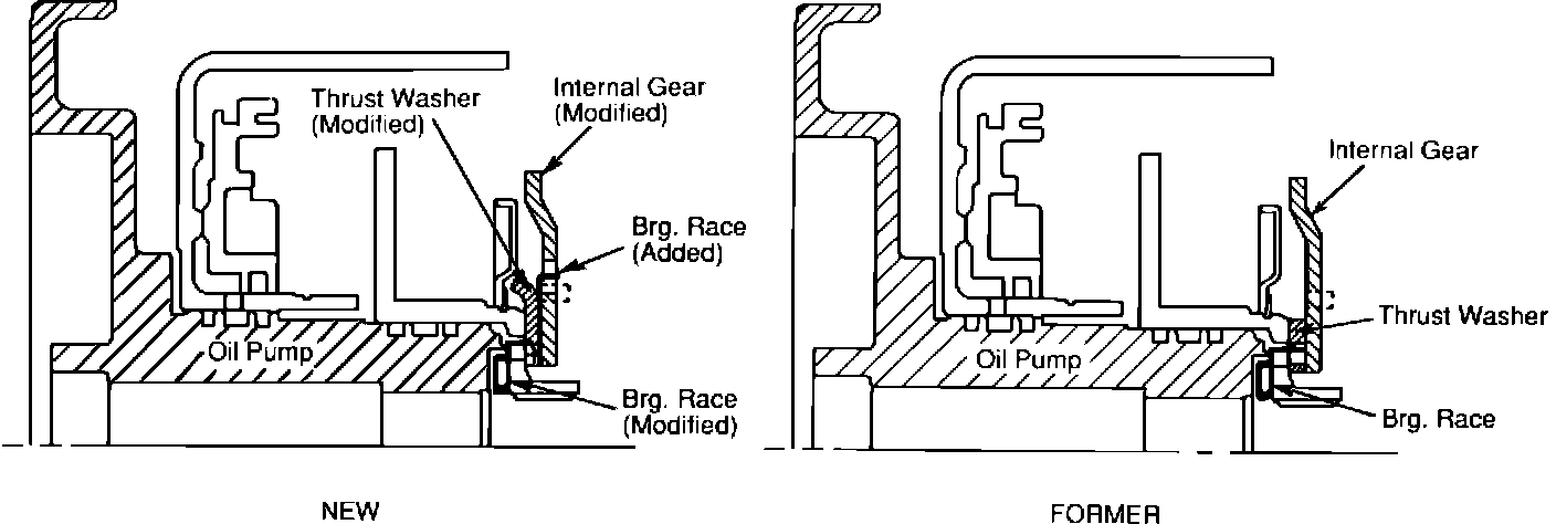To increase thrust washer durability, the material has been changed from plastic to metal. To accomodate this change, a bearing race has been added to the internal gear side, and the oil pump side bearing race and internal gear have been modified [Figure 1].