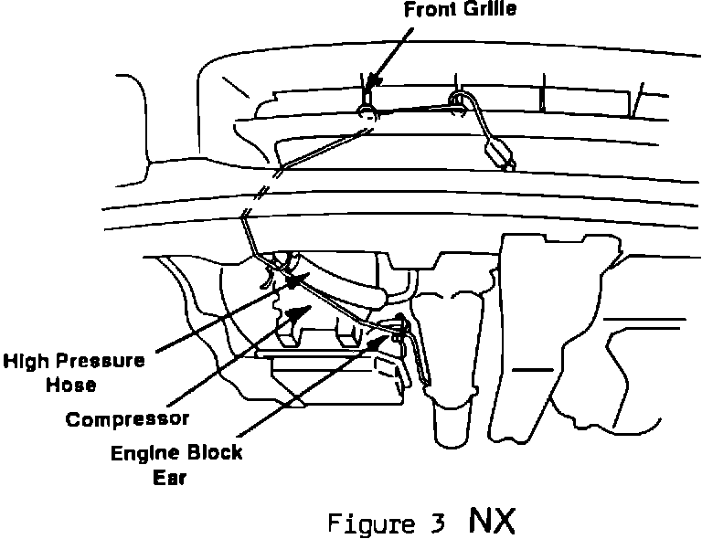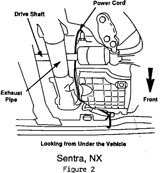 A. From engine block heater route cord down, between drive shaft and engine block, toward front of the vehicle between exhaust pipe and engine oil pan (Figure 2). Attach cord to engine block ear on left side of compressor with a tie wrap. Continue routing cord along the left side of the compressor and attach it to the compressor high pressure hose (rubber portion) with a tie wrap.