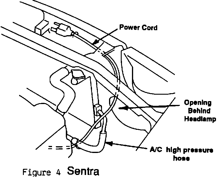 Sentra: Route cord up and toward the right, through the opening behind right head lamp, between the two legs securing the front grille to the radiator core support. Secure cord to vertical member of front grille with a tie wrap (Figure 4).