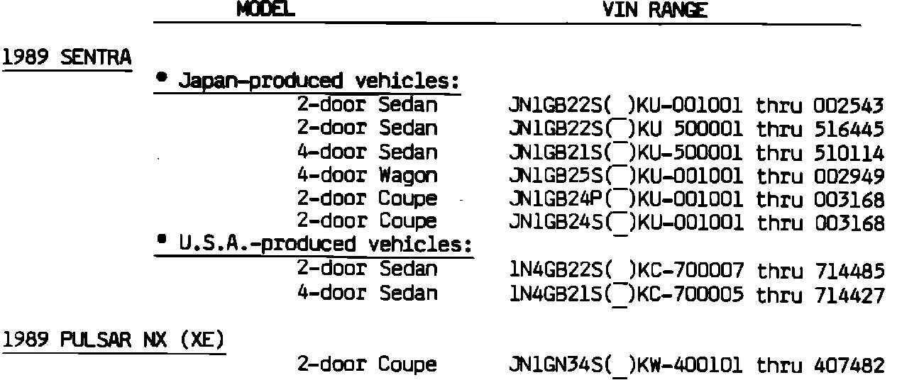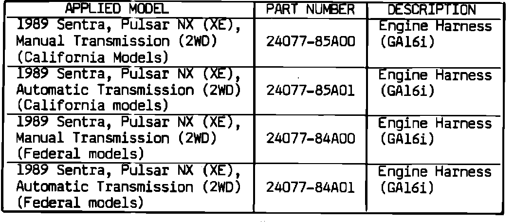 Early production 1989 Sentra and Pulsar XE vehicles which were shipped from the ports before September 27, 1988 had a section of the starter wiring harness located very close to the E.G.R. valve. In some cases, exhaust heat could damage this harness. This information was already communicated to Nissan dealerships in a Datanet Message in late September, and corrective measures were published and sent to dealers in a Service Advisory (TS88-134), dated October 10, 1988.