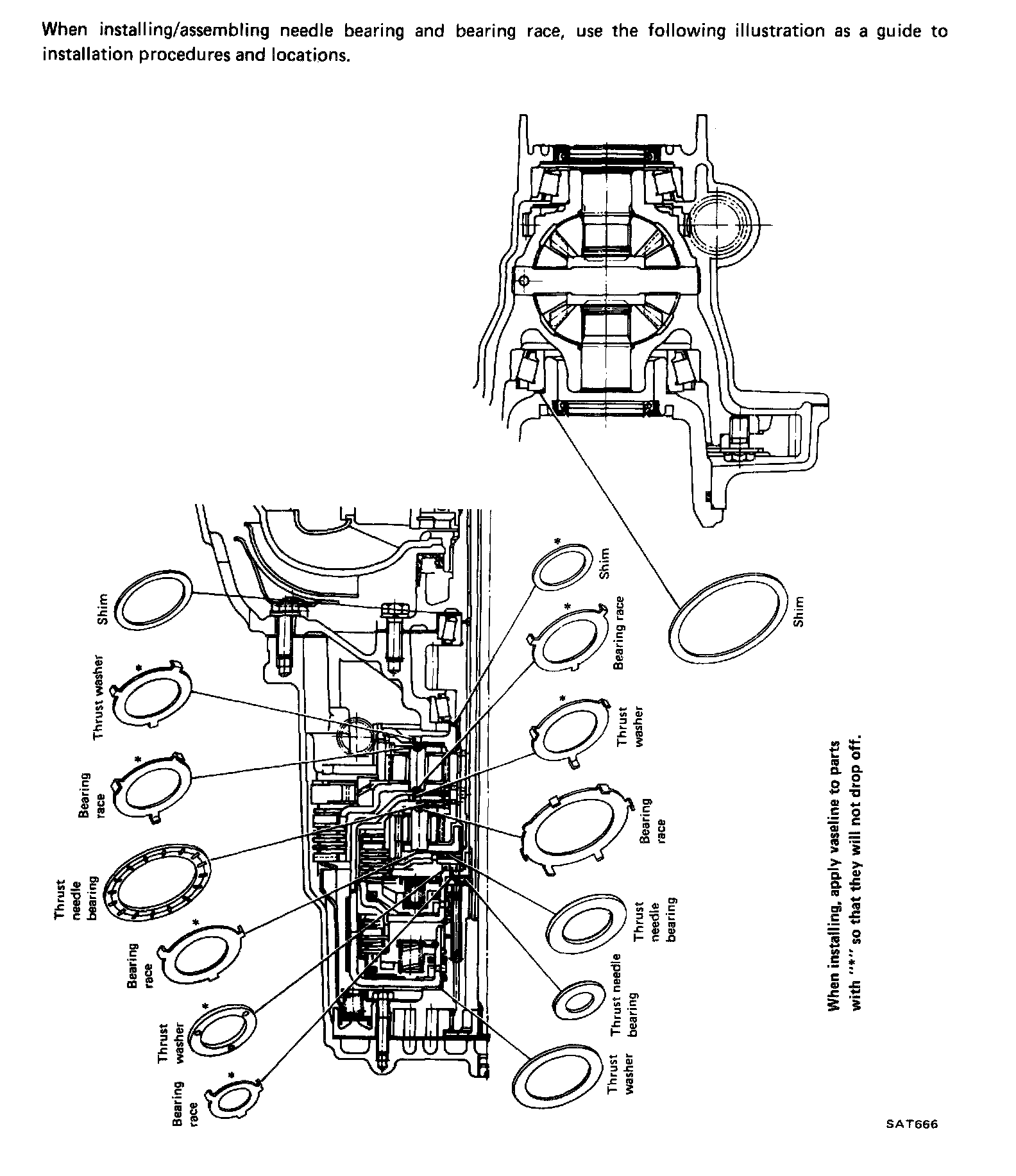 When installing/assembling needle bearing and bearing race, use the above illustration as a guide to installation procedures and locations.