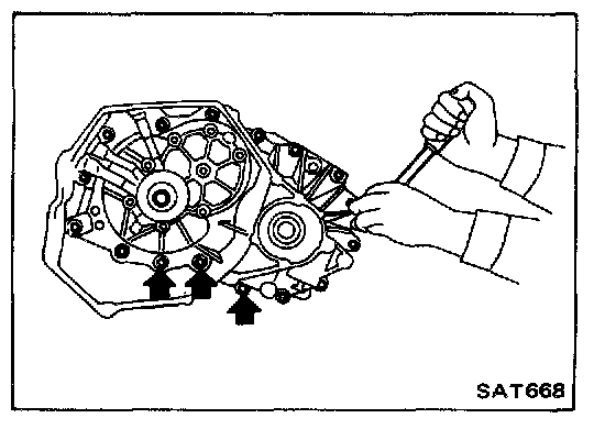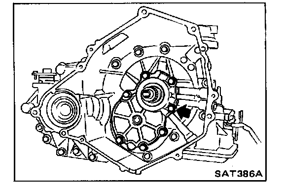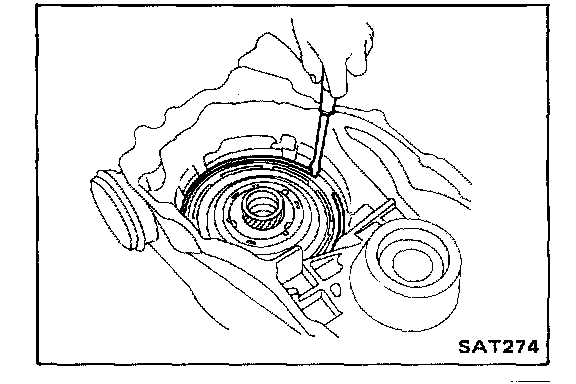 28. Turn parking gear (rear internal gear) clockwise with screwdriver while supporting converter housing assembly by hand, until output shaft splines, front carrier, and rear internal gear are engaged properly.