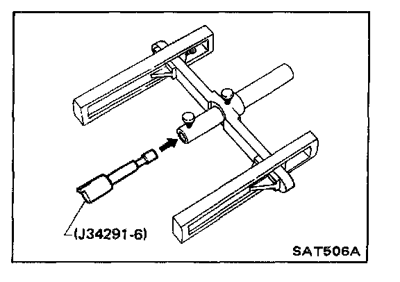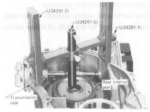 a. Place J 34291-1 (bridge), J 34291-2 (legs) and J 34291-5 (gauging cylinder) on machined surface of transmission case (no gasket). Position bridge legs so the short ends of the legs are down, and adjust legs to fit onto housing properly. Allow gauging cylinder to rest on center machined surface of rear internal gear and lock it in place with thumbscrew.
