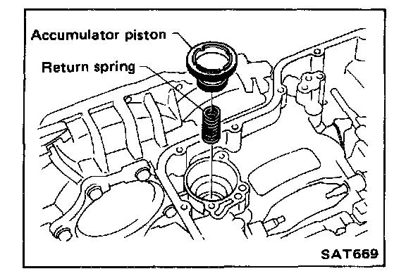 30. Apply vaseline to lathe cut ring, then install return spring and accumulator piston on transmission case.