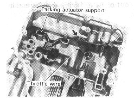 32. Assemble parking actuator support and throttle wire to transmission case.