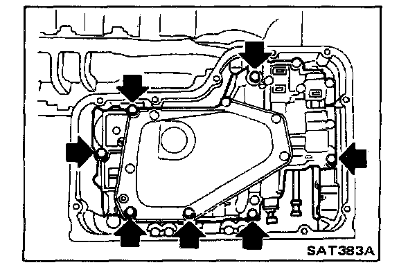 Before installing bolts marked in figure at left, ensure that bolt threads are clean and that looking sealant has been applied. Apply A.T.F. to threads of other bolts. Ensure that the transmission case has been cleaned with solvent.