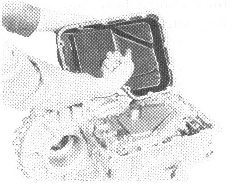 5. Remove oil pan guard and oil pan and inspect its contents. An analysis of any foreign matter can indicate the types of problems to look for. If the fluid is very dark, smells burned, or contains foreign particles, the frictional material (clutches, band) may need replacement. A tacky film that will not wipe clean indicates varnish build up which can cause valves, servo, and clutches to stick and may inhibit pump pressure.