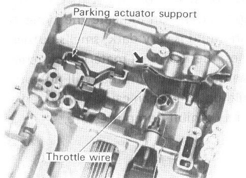 9. Disconnect throttle wire from throttle lever, then remove throttle wire. Remove parking actuator support from transmission case.