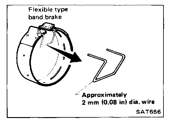 To prevent brake linings from cracking or peeling, do not stretch the flexible band unnecessarily. Before removing the brake band, always secure it with a clip as shown in the figure at left. Leave the clip in position after removing the brake band.