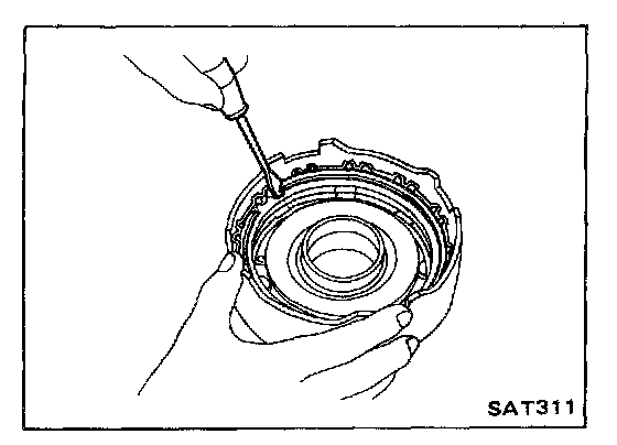 - Compress clutch springs and remove snap ring from spring retainer.