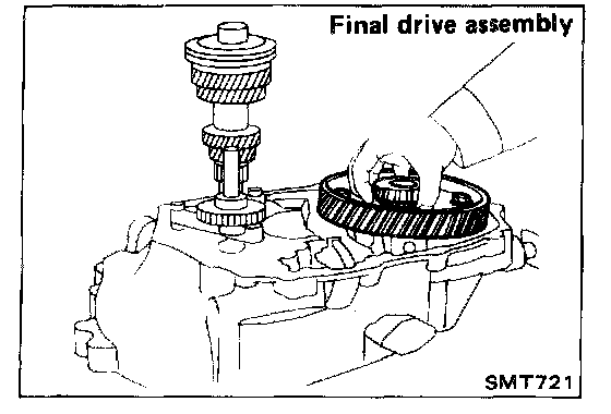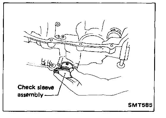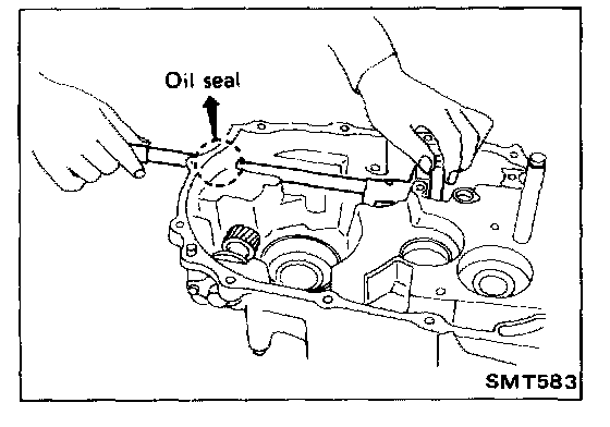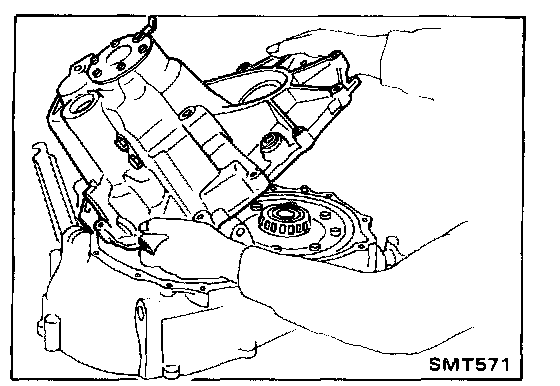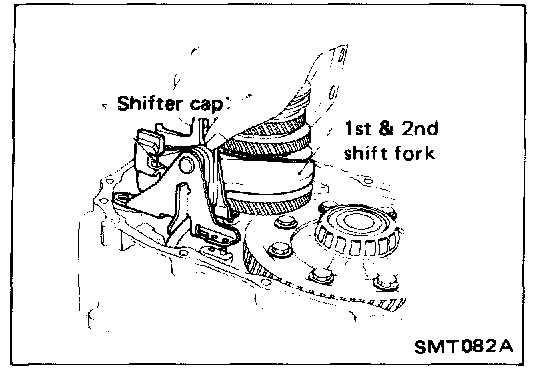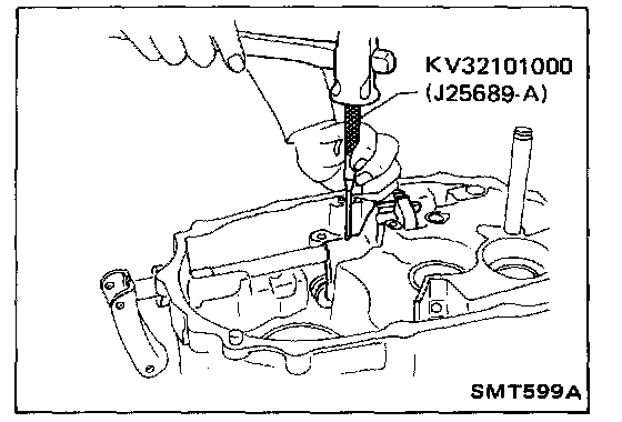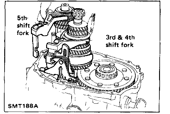 1. Remove transmission case while slightly tilting it to prevent 5th shift fork from interfering with the case.