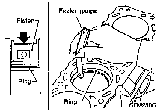 - If out of specification, replace piston ring. If gap exceeds maximum limit with new ring, rebore cylinder and use oversized piston and piston rings.