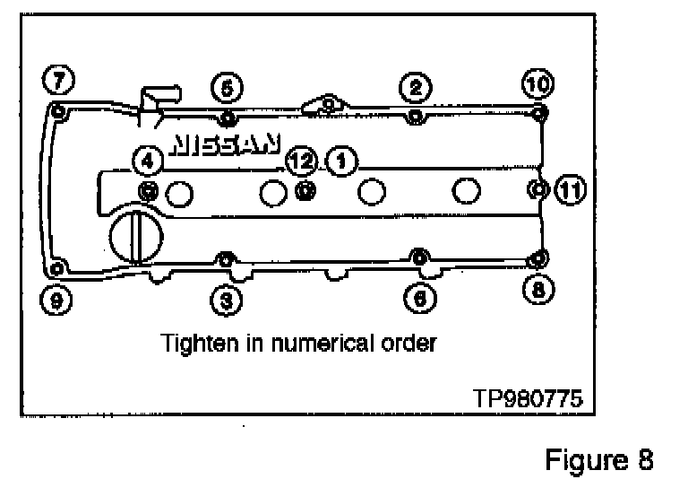 6. Install rocker cover, tightening the bolts as shown in Figure 8.