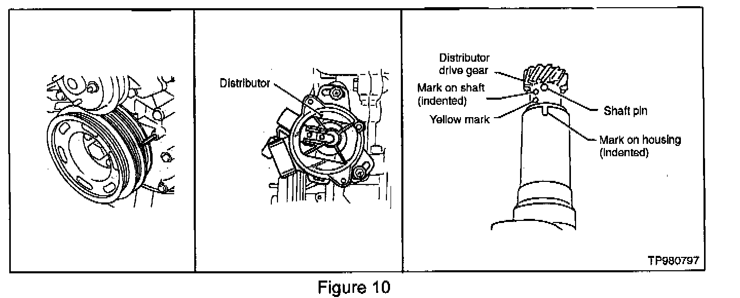 ^ If the vehicle is a 1995 through 1998 refer to Figure 10. Make sure the # 1 piston is set at TDC, the marks on the distributor shaft align with the indented mark on the distributor housing, and that the distributor rotor is set at # 1 cylinder spark position once it is installed in the engine.