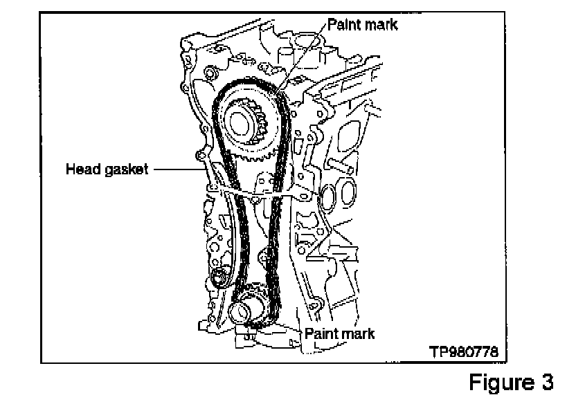 12. Wipe off the links of the timing chain next to the timing marks on the sprockets. Put paint marks on the timing chain, matching them with the timing marks on the crankshaft sprocket and idler sprocket (see Figure 3).