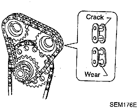Check for cracks and excessive wear at roller links. Replace the chain if necessary.