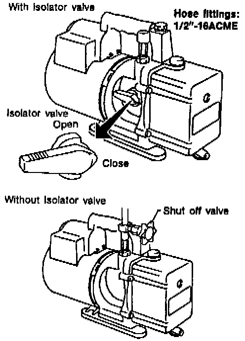 ^ If the hose has an automatic shut off valve, disconnect the hose from the pump. As long as the hose is connected, the valve is open and lubricating oil may migrate. Some one-way valves open when vacuum is applied and close under a no vacuum condition. Such valves may restrict the pump's ability to pull a deep vacuum and are not recommended.