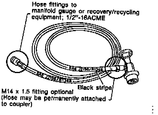 Be certain that the service hoses display the markings described (colored hose with black stripe). All hoses must include positive shut off devices (either manual or automatic) near the end of the hoses opposite the manifold gauge.