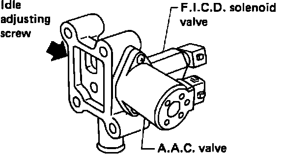When voltage is applied to the coil of the A/C compressor clutch, voltage is also supplied to the Fast Idle control Device (FICD). The FICD becomes energized and opens an additional air pasage. Air by-passes the throttle valve, thereby raising idle speed.