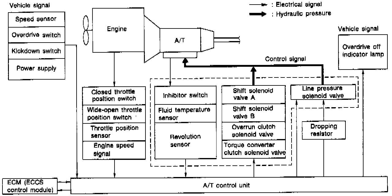 This system utilizes a microcomputer for accurate control of vehicle speed, lock-up operation, gear shift timing and other functions. It corresponds to the throttle opening, actual vehicle speed, engine rpm and range position signal.