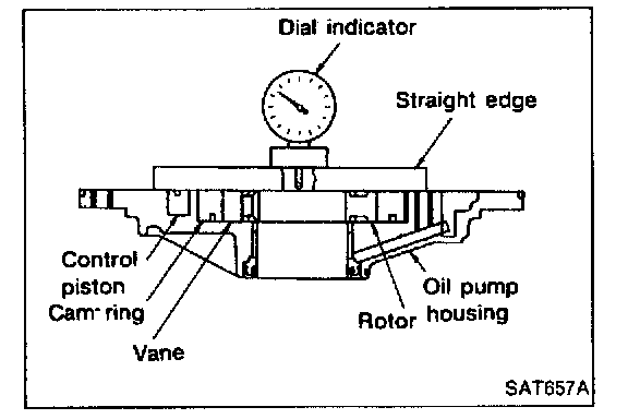 - Measure side clearances between end of oil pump housing and cam ring, rotor, vanes and control piston in at least four places along their circumferences. Maximum measured values should be within specified positions.