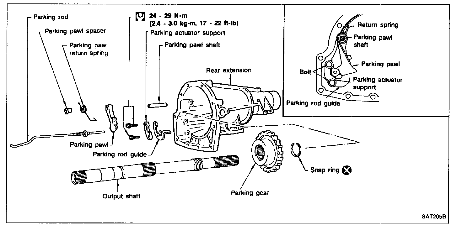 2. Remove return spring, pawl spacer and parking pawl from rear extension.
