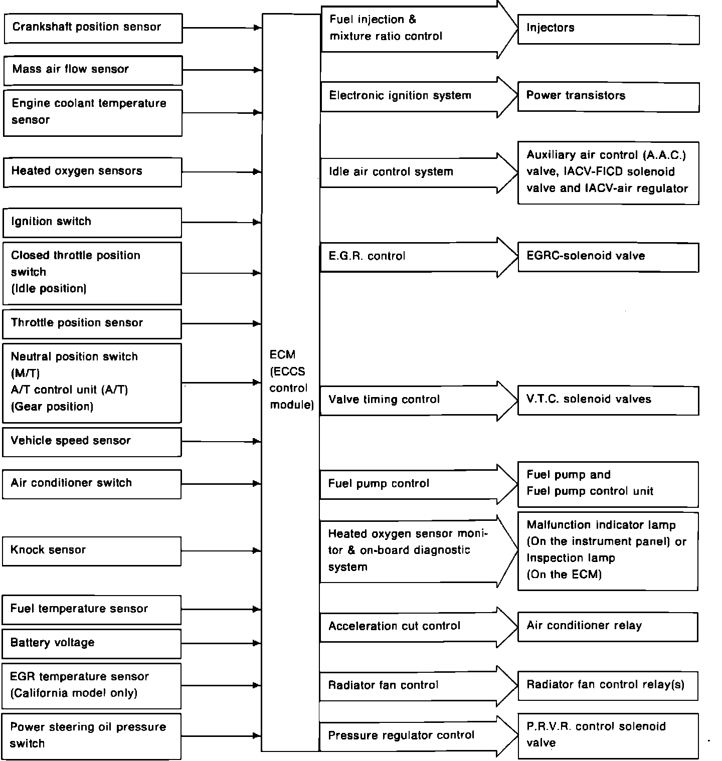 The term used by Nissan to identify the Computerized Engine Control System is ECCS (Electronic Concentrated Engine Control System). The system is comprised of an ECM (electronic control unit/module), sensors (input devices) and actuators (output devices). The ECCS system also has built-in Self-Diagnostics and a Fail-Safe system.