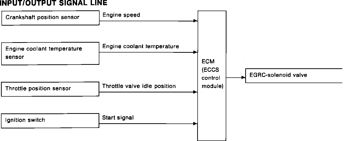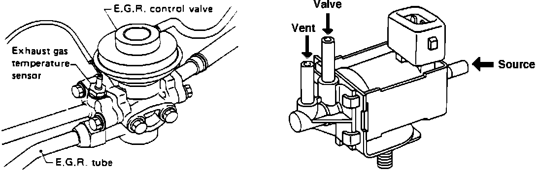 When conditions are NOT suitable for EGR operation, based on signals sent via the crank angle sensor, air flow meter, engine temperature sensor and the ignition switch, the ECM energizes the solenoid. Refer to EMISSION CONTROLS for further description of the EGR valve.